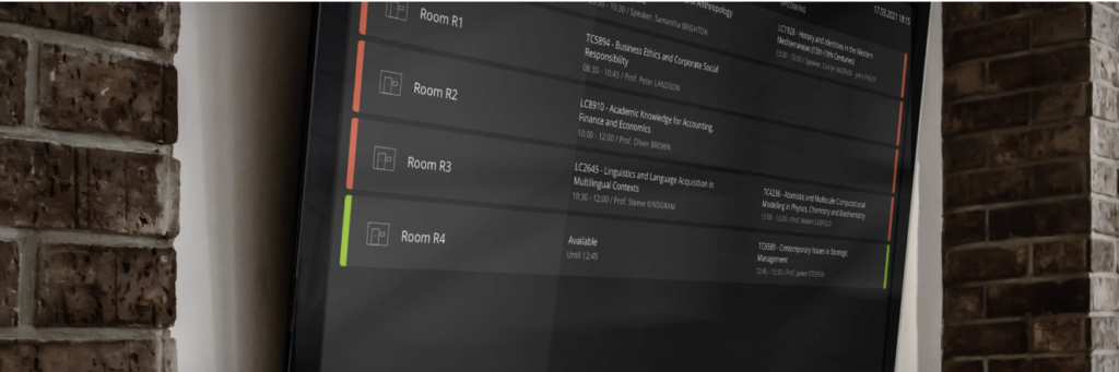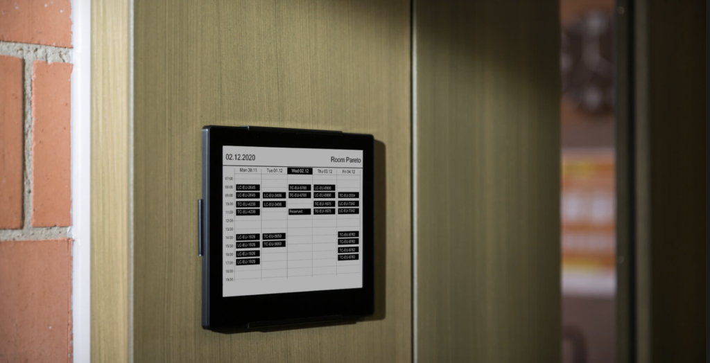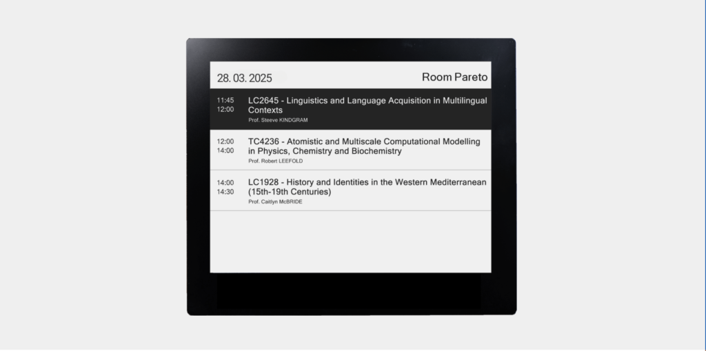 Med ROOMZ e-paper displays vises den aktuelle lokaleplan direkte ved indgangen til hvert undervisningslokale – automatisk opdateret i realtid.