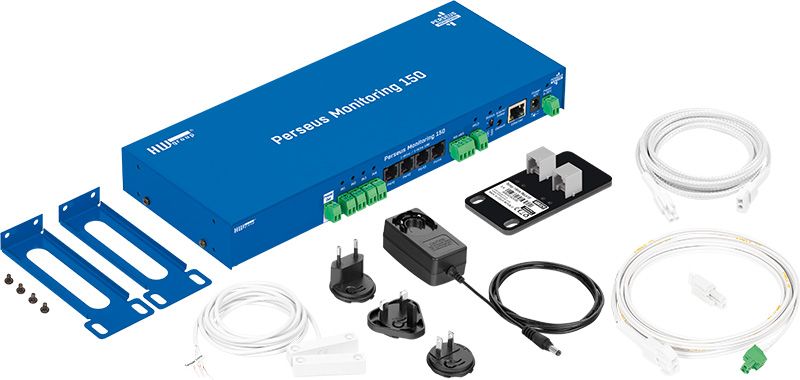 HW Group Perseus Monitoring 150 er en professionel enhed til fjernovervågning af miljøforhold i datacentre, serverrum og industrielle installationer. Den understøtter op til 100 eksterne sensorer og tilbyder 8 RJ11-porte til 1-Wire UNI, 16 digitale indgange (dry contacts), 4 relæudgange og en WLD-zoneinput til vandlækagedetektering. Enheden er udstyret med et RS-485 interface, der muliggør kommunikation med tredjeparts enheder som UPS, el-målere og klimaanlæg via Modbus/RTU.