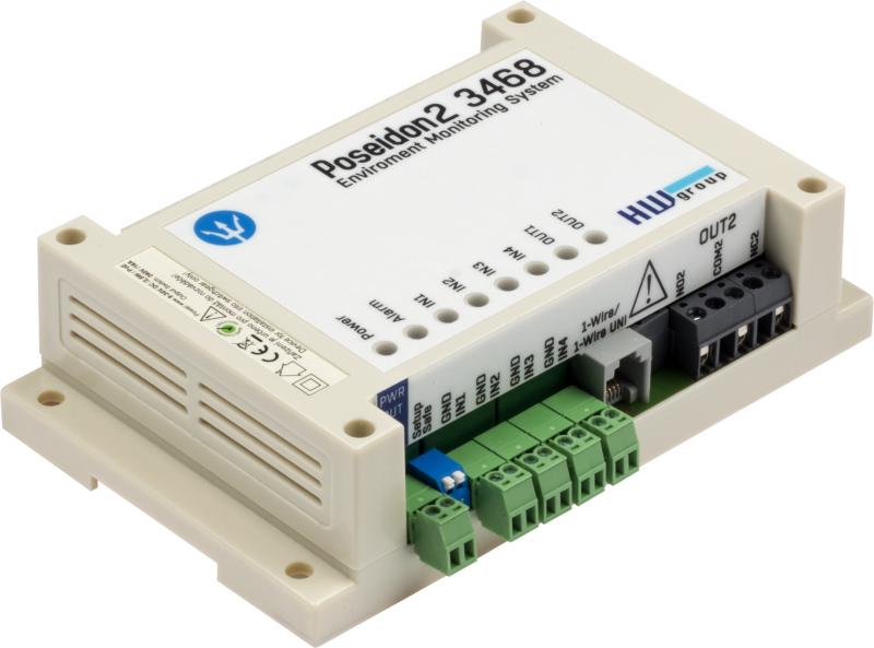 HW Group Poseidon2 3468 er en alsidig IoT-enhed til fjernovervågning og styring. Den understøtter op til 8 sensorer via 1-Wire UNI, har 4 digitale indgange, 2 relæudgange og 8 virtuelle digitale udgange. Med avancerede kommunikationsprotokoller som MQTT, Modbus/TCP og SNMPv3 sikrer den pålidelig overvågning og hurtig alarmering via e-mail, SMS og SNMP.