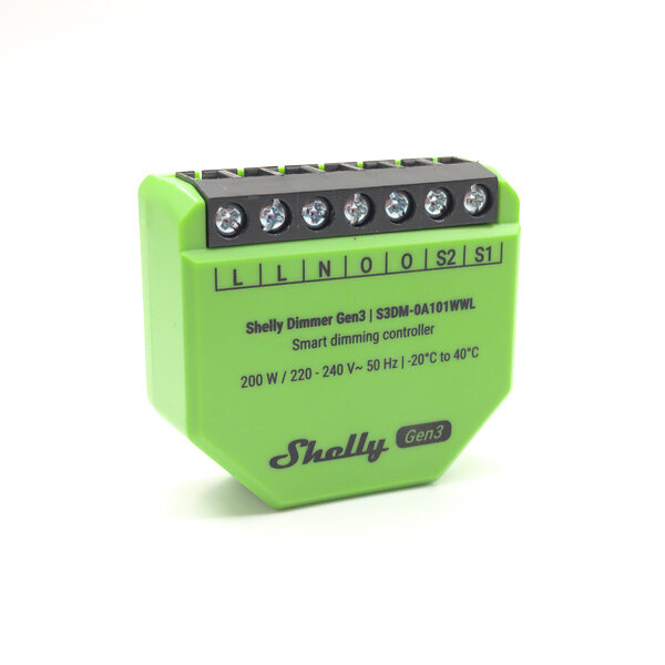 Shelly Dimmer Gen3 er en kompakt smart dimmer, der installeres bag eksisterende kontakter og kan anvendes med eller uden neutralleder. Den understøtter Wi-Fi og Bluetooth, effektmåling og avancerede automatiseringsmuligheder — ideel til fleksibel belysningsstyring i moderne hjem.