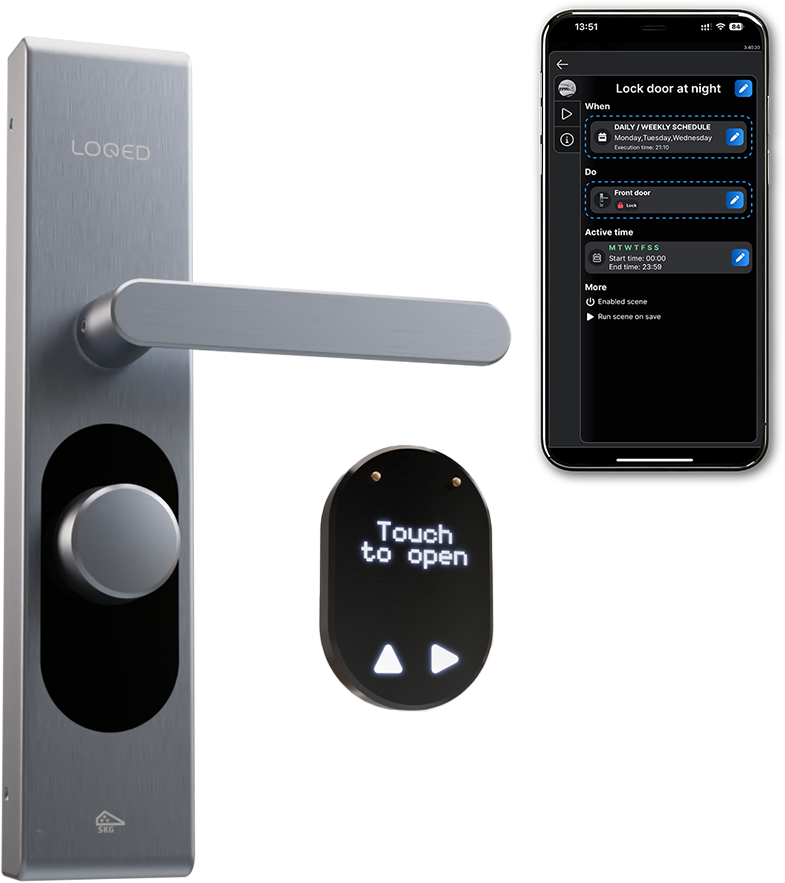 LOQED Touch Smart Lock Black Edition giver dig en fuldstændig nøglefri oplevelse, hvor du kan låse døren op med et enkelt tryk, via din smartphone, en personlig kode eller automatisk, når du nærmer dig med din telefon. Låsen kombinerer avanceret teknologi, brugervenlighed og et stilrent design i sort finish, der passer perfekt til moderne boliger.