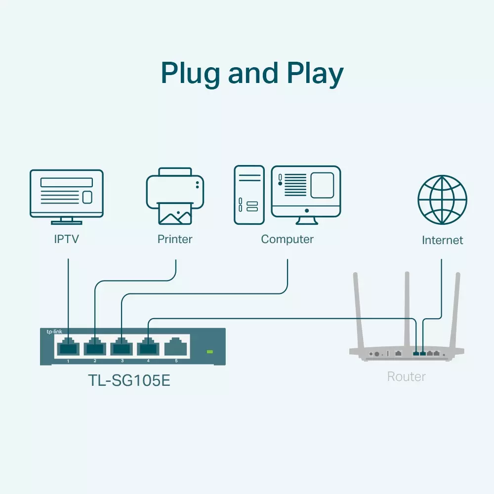 TP-Link TL-SG105E er en 5-ports Gigabit Easy Smart switch, der kombinerer høj ydelse, driftssikkerhed og enkle managementfunktioner. Den er ideel til hjemmenetværk, små kontorer og arbejdsstationer, hvor der er behov for både hurtig dataoverførsel og fleksibel trafikstyring.