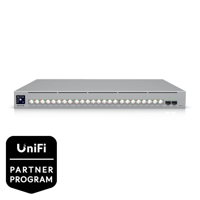 Ubiquiti ECS-24-PoE er en avanceret Layer 3 Etherlighting™ PoE+++ switch designet til store netværk og campusinstallationer. Den tilbyder 8 × 2,5 GbE PoE+++, 16 × 10 GbE PoE+++ og 2 × 25 GbE SFP28 porte. Med en samlet PoE-effekt på op til 1.050 W i delt tilstand og redundante strømforsyninger sikrer den høj tilgængelighed og skalerbarhed.